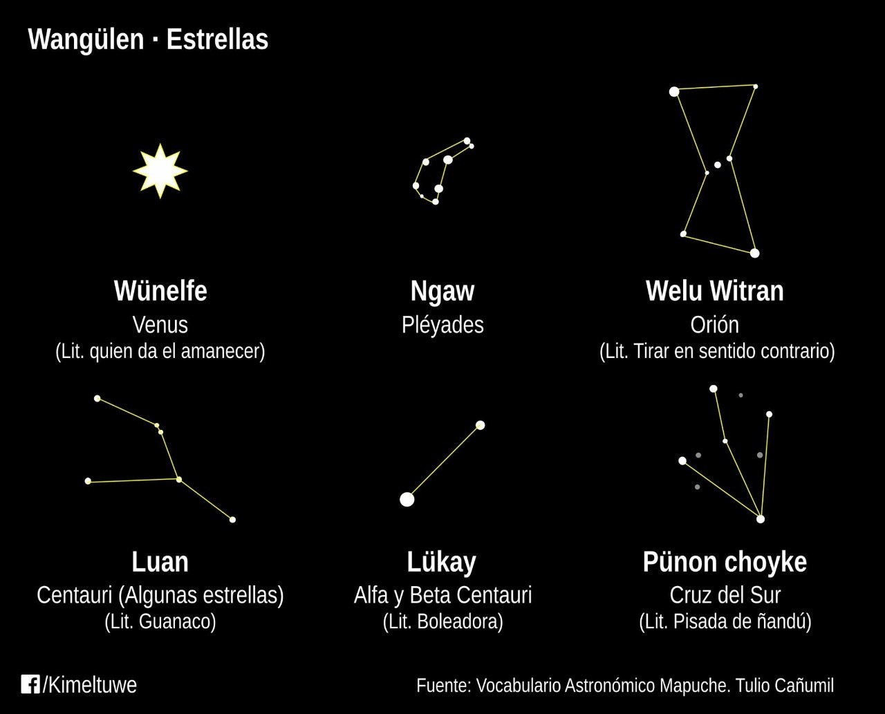 Así, lo que conocemos, desde la visión occidental como la constelación de la cruz del sur, desde la cosmovisión mapuche se conoce como pünon choyke (pisada de ñandú). También están las pléyades, que en mapuzungun son las naw poñu o papas conglomeradas. “ Los mapuche veían prácticamente lo mismo que hay en el nagmapu en el wenumapu”, dijo Rodríguez, agregando que a la vía láctea se le llama wenuleufú, espacio por el que se desplazan las almas una vez que dejan la tierra.