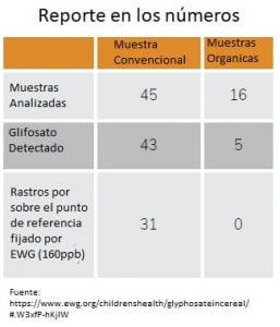 EWG analizó más de una docena de marcas. En al menos el 75 por ciento de los productos,entre ellos Kellogg’s, Quaker y Cheerios, fueron encontrados niveles superiores al que el grupo activista fija como seguros para el consumo, sobre todo de niños y niñas.