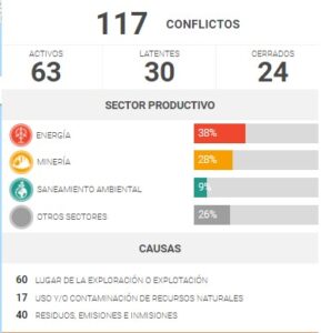 Los principales sectores productivos asociados a los conflictos son: energía, con 56 casos; minería, 45; pesca y acuicultura, 7; forestal, 5; y agropecuario, 4. Las causas de estos conflictos se refieren al lugar de la explotación o exploración; residuos y emisiones y contaminación de recursos naturales.