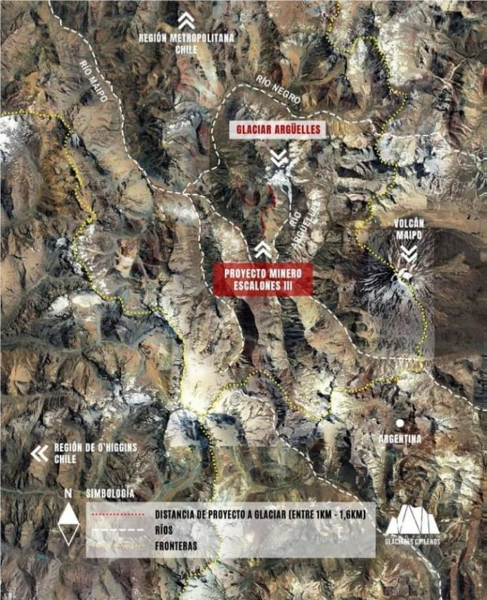 Mapa elaborado por la Fundación Glaciares Chilenos, que muestra la proximidad entre el proyecto minero Escalones III y el glaciar Argüelles, a una distancia equivalente a 16 cuadras.